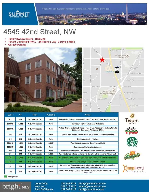 Walk to Tenleytown Metro, 911 square foot office suites can be combined for 1,822 square feet, or 3,644 square feet. Flexible office hours because tenant controls its own HVAC. Monthly garage parking and hourly street available. Signage available for first floor spaces.