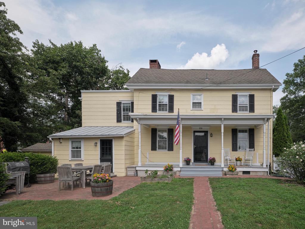 Charming home on historic Court Street - with original part of home dating back to 1811. Enter through the picket fence and step up to the charming front porch - recently painted. This is the perfect place to sit and enjoy the front yard - lemonade and cocktails were made just to enjoy this spot. The front door leads to the dining room - currently used as a living room. A restored, walk-in stone fireplace (restored by Chimney Savers 11/23) is the highlight of this room, along with the beamed ceiling. To the right, and open to the dining space is the living room with a decorative mantel and beamed ceiling. Step down to the updated kitchen to find shaker style cabinetry, granite counters, new sink, stone accent wall behind the stove, dining area, newly refinished random width pine flooring, and large windows overlooking the fenced in yard. A laundry and mud room is adjacent to the kitchen and accessed via a french door. This sunny room also leads out to the fenced in yard and features lots of storage and is adjacent to the powder room with granite vanity and undermount sink. Charming butterfly stairs lead to the second floor which features 3 bedrooms. The primary bedroom has built-in storage and closets that flank windows as well as a sweet window seat providing additional storage. There are two additional bedrooms, the larger of which features a vaulted beadboard ceiling with original beams, track lighting and exposed stone wall. The hall bath on this level features a shower, beadboard wainscot and a pedestal sink. The third level is a suite that provides a birds eye view of the rooftops in Newtown. A bedroom with gabled ceiling opens to a spacious bath with Kohler jetted tub, pedestal sink, and large storage closets. A converted garage provides additional living space. This room has dramatic cathedral ceiling, gas fireplace, custom built-ins, recessed lighting and serves as an additional family room, office, and game room. There is additional storage on the exterior of this building for garden tools and toys. A sweet shed also provides a place to store potting materials and yard tools. Included are plans for an addition that would create a new primary suite and bath as well as create staircase from kitchen to second level. Ideally located in town - walk to everything Newtown has to offer!