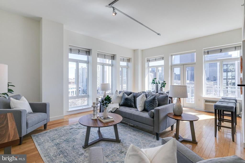 Enjoy panoramic city skyline views from this corner two bedroom, two bath residence with 1 CAR GARAGE PARKING. This deluxe condominium offers soaring ceiling heights, hardwood floors and expansive windows which fill your space with an abundance of light. The chef's kitchen boasts a breakfast bar, stainless steel appliances, and rich granite counter tops. The main bedroom suite features an oversized walk-in closet and an en-suite spa-like bathroom showcasing designer finishes and a walk-in shower. The second bedroom is generously proportioned and boasts ample closet space. A 24-hour front desk attendant, state of the art fitness center, PLUS 1 CAR GARAGE PARKING INCLUDED complete this beautiful home at the Tivoli. Perfectly situated in the Art Museum Area, this residence is just a short distance to fine dining with one of a kind shopping, and world renowned cultural destinations. Whole Foods Market, Target and the Barnes Museum are conveniently located right at your doorstep. **Photos are from another unit with similar finishes and identical floor plan.